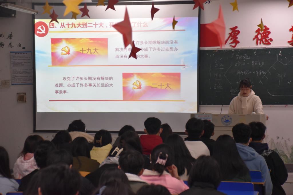 为深入学习贯彻习近平新时代中国特色社会主义思想,认真贯彻落实《中共中央关于认真学习宣传贯彻党的二十大精神的决定》,beat365英国官网网站于12月6日晚在香远楼405教室举行“永远跟党走,奋进新征程”党的二十大学生宣讲活动,此次活动由beat365英国官网网站宣讲团杨斐斐同学宣讲。