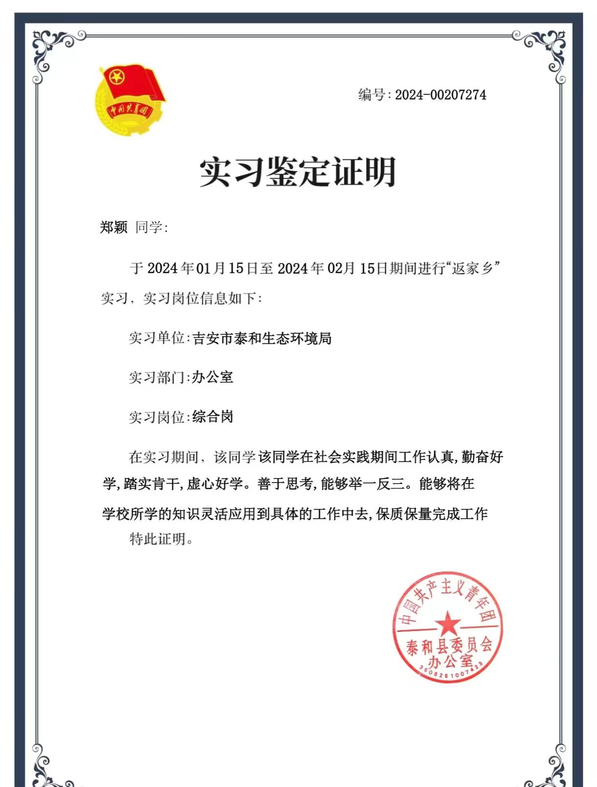 为更好地助力青少年健康快乐成长,寒假期间,团红谷滩区委、九龙湖街道团工委、安丰花园社区团支部组织“青英归巢“返乡大学生志愿者开展”缤纷冬日,快乐成长”寒假小课堂活动。beat365官网志愿者惠琬欣积极响应号召。郑颖同学于吉安市泰和生态环境局实习。在实践中,通过切身体会,加深了对环境监测保护的工作和职责的认知,并对其在国家机关中的重要作用有了深刻理解。通过实习,郑颖同学增长了自己的见识,提升了自己的才能,培养了自己的韧性,受益匪浅。