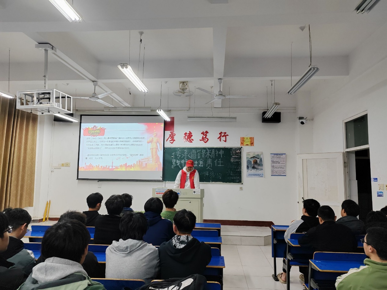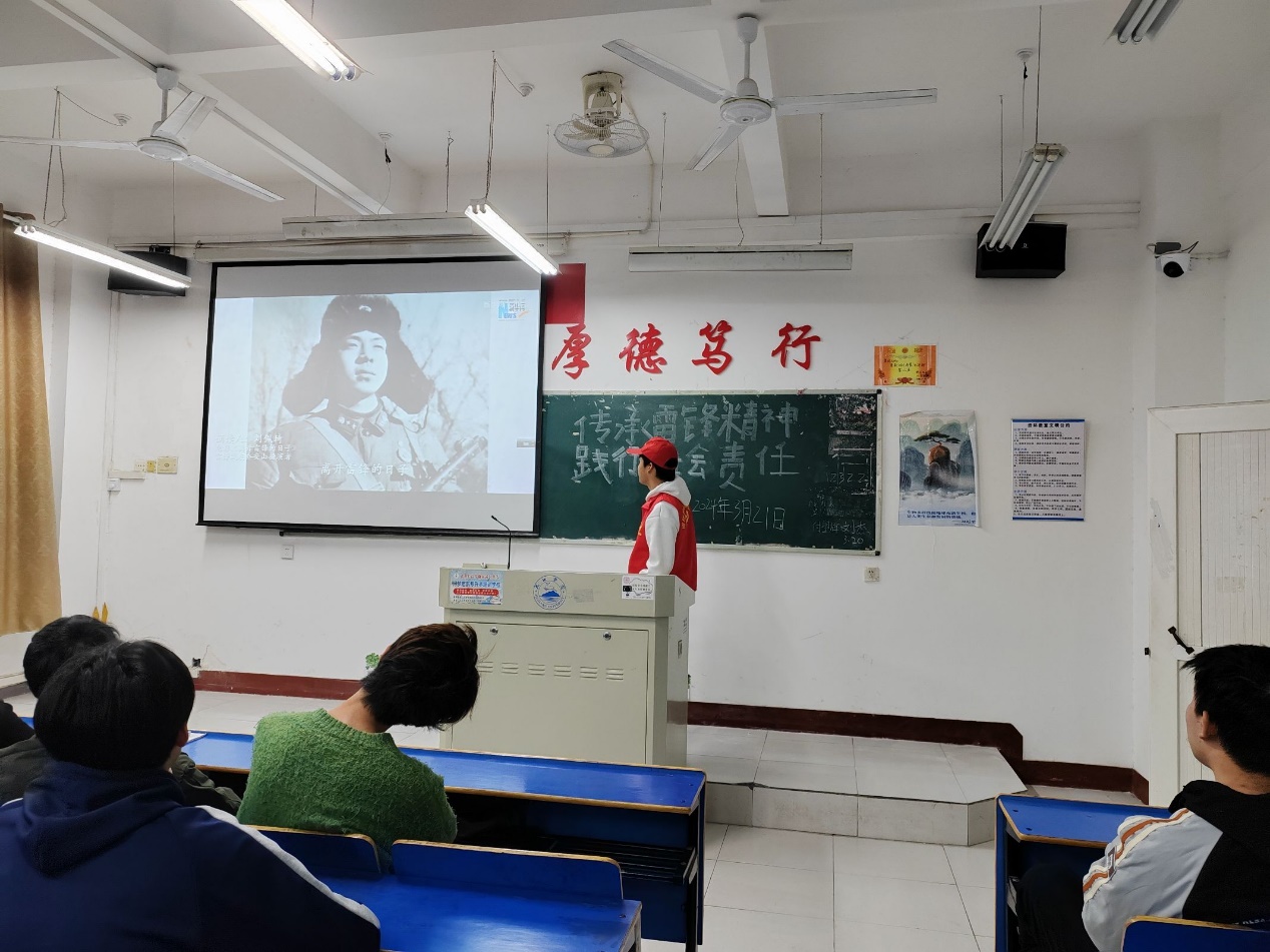 志愿者们通过讲解雷锋生前的种种感人事迹并通过短片的方式介绍雷锋服务人民,助人为乐的奉献精神。使得同学们更能深刻的理解雷锋同志将崇高的理想信念融入自己的工作和生活,在自己岗位上做一颗永不生锈的螺丝钉的精神内核。