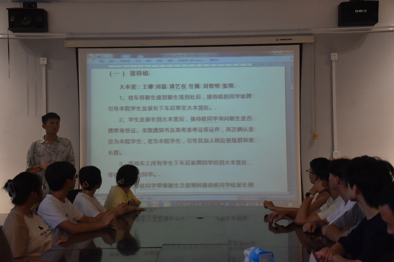 学生干部代表李锦介绍了迎新具体流程,同时公布了各新生助导的工作任务,补充了几点迎新过程中需要注意的问题,保证迎新工作有条不紊的进行。其次,还将迎新前的准备工作布置到位,并对所有参与人员提出了在迎新工作中的要求,希望所有人能够将此次迎新活动做到充分化,程序化,文明化。