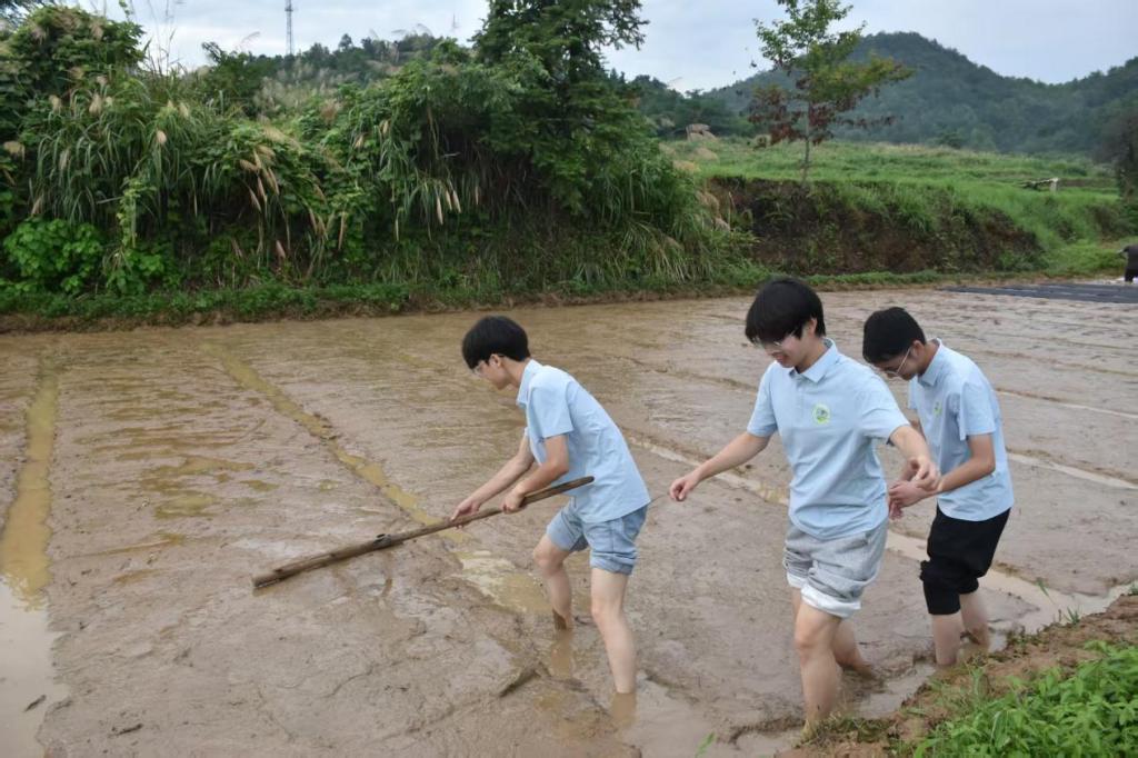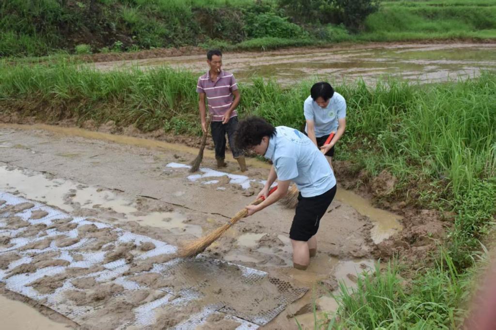 在泥泞的水田里,队员们分组展开平田作业。一组同学手持木耙,弓腰将田里的泥块仔细打碎、抹平,反复调整力度确保田面平整。"看似简单的推耙动作,要掌握好深浅真不容易",参与劳作的同学感叹道。另一组队员则用扫帚等工具认真清理田中残留的育秧设施,为后续插秧做好准备。