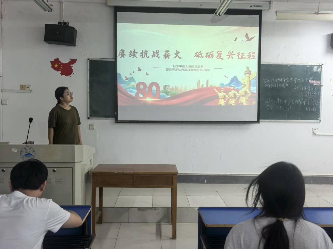 9月4日,学院组织各班开展了"纪念中国人民抗日战争暨世界反法西斯战争胜利80周年"主题团日活动。各班团支书带领同学们齐唱团歌,学习抗战历史,观看阅兵视频,引导青年学生深刻认识抗战精神的内涵与价值,增强历史使命感,激发为民族复兴贡献力量的青春热情。