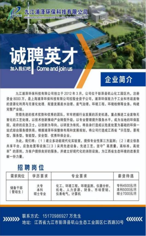 九江浦泽环保科技有限公司招聘简章