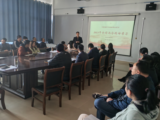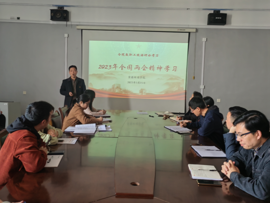 为及时传达学习2023年全国两会会议精神,3月15日下午,在厚德楼709会议室,beat365英国官网网站召开2023年全国两会精神学习会。会上学院党委书记杨期勇为全体教职工作2023年全国两会精神专题辅导报告,学院党政领导和全体教师参会。