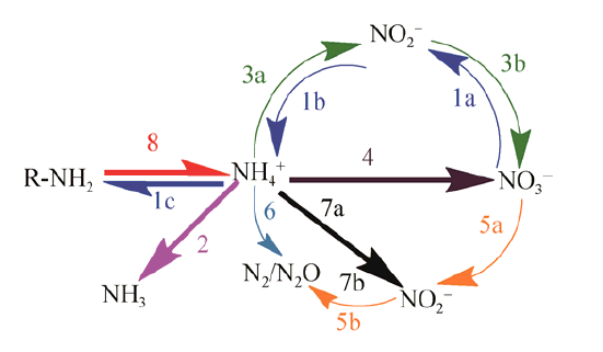 菌藻协同体系对无机氮的去除机理主要涉及同化作用[3]。氧化态氮的同化如NO3–或NO2–首先还原为NH4+态,然后进一步融入氨基酸,而还原态氮(NH4+)可以被微藻直接同化。具体来说,硝酸盐还原酶利用烟酰胺腺嘌呤二核苷酸(NADH)的还原形式传递两个电子,使硝酸盐转化为亚硝酸盐。然后亚硝酸盐被亚硝酸还原酶转化成铵,使用铁氧还蛋白(Fd)作为电子供体。因此,所有形式的无机氮最终都转化为铵,然后利用谷氨酸和ATP 将铵结合到氨基酸中。除同化作用外,氨挥发作用、硝化作用和反硝化作用也是无机氮去除过程中的关键机理。